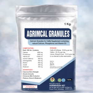 Agrimcal Granules is a calcium-rich veterinary supplement with Vitamin D3 and herbal extracts to strengthen bones, boost immunity, and improve milk production in cattle, buffaloes, calves, sheep, and goats.